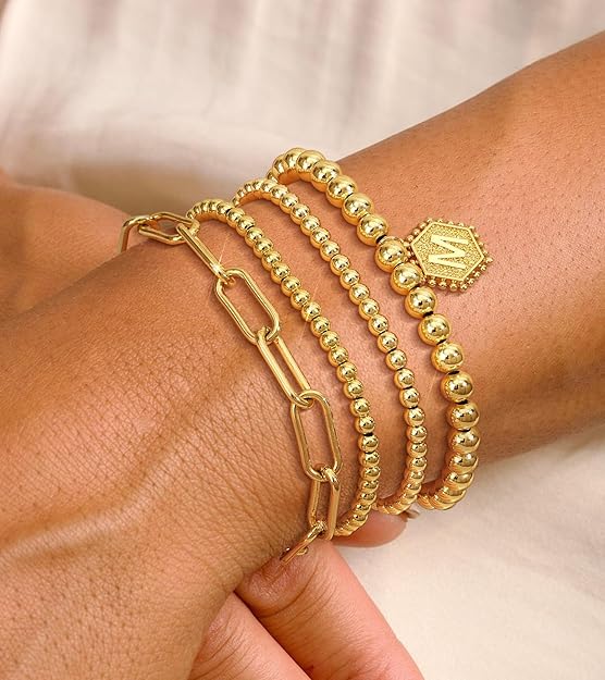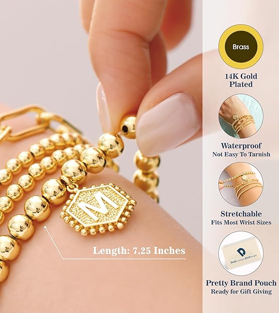Initial Gold Bracelets: This personalized stack features a dainty 14K gold plated initial charm, high-polished to a brilliant shine. It is the perfect piece to represent your name or the name of someone special.